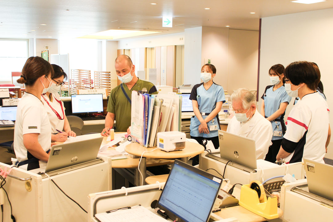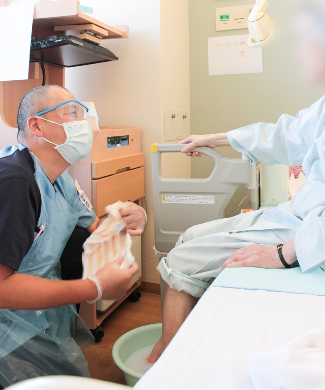 急性期の治療が終了し症状が安定された方に対し、自宅退院されるまでや施設入所までの期間に療養しながらリハビリをおこない自立した生活が送られるよう、医師・看護師・介護士・リハビリ等の多職種で支援することを目的とした病棟です。また、在宅生活を長期的に継続されている方の短期入院(レスパイト入院)を受け入れるなど、ご家族の支援もおこなっています。コロナ禍で季節に合わせたレクリエーションができないため、入院中であっても楽しみや季節感をかんじられるよう、壁飾りをおこなうなど工夫しています。