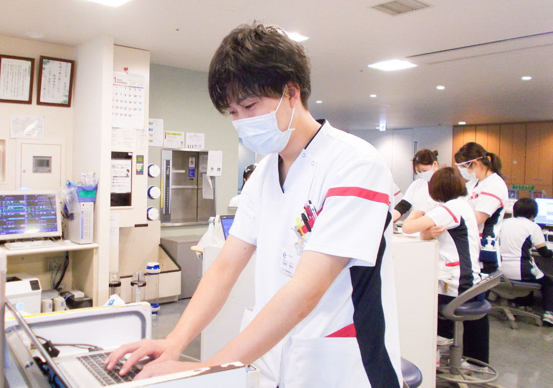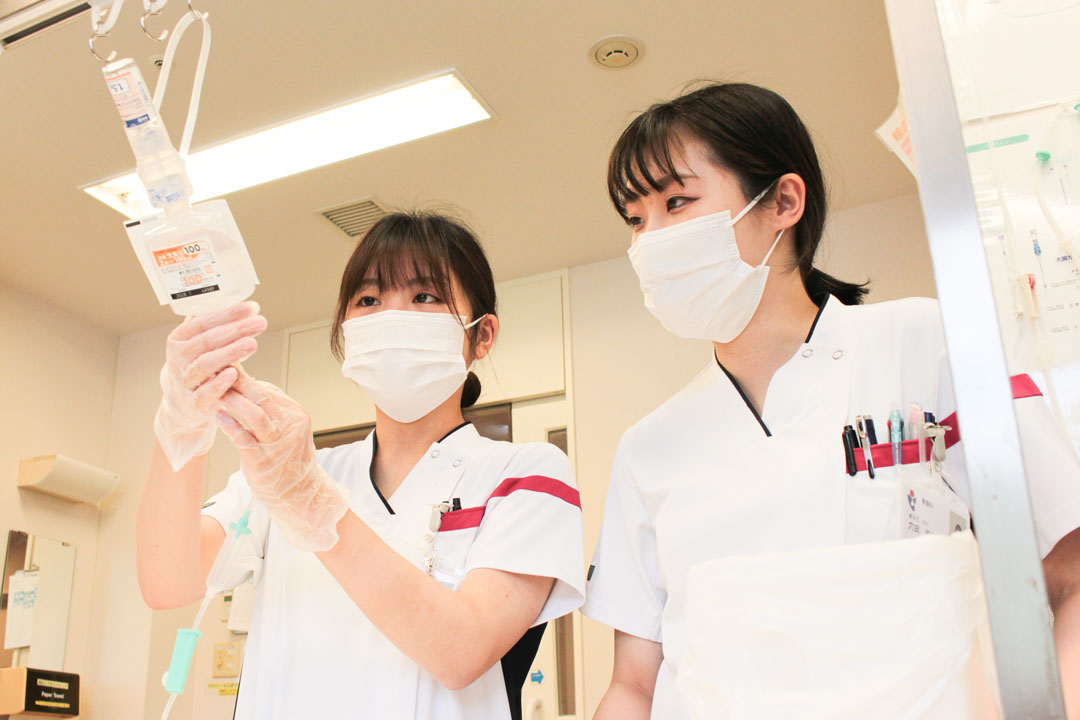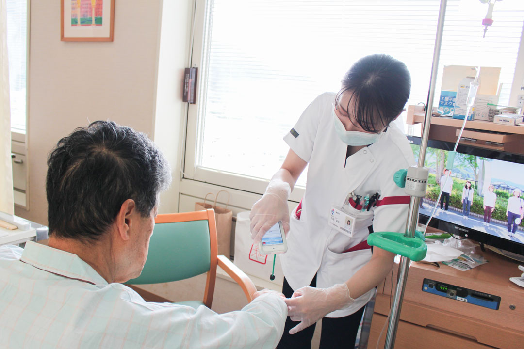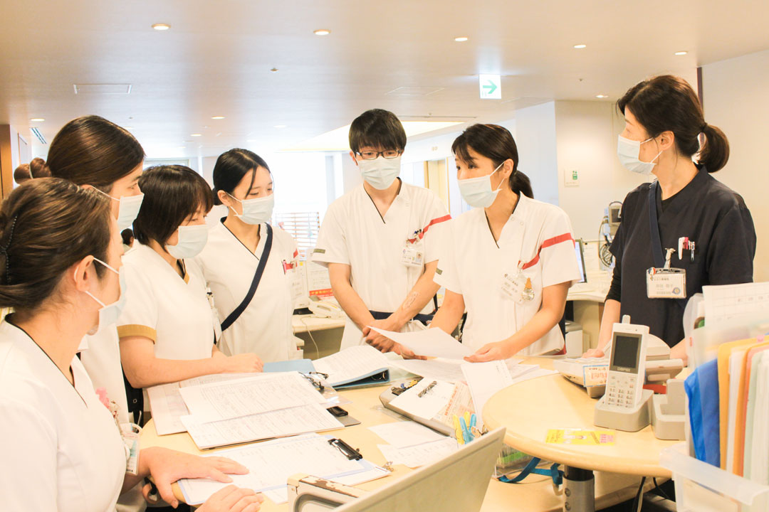 当病棟は周術期からリハビリテーション期、またターミナル期まで患者さんがスムーズに段階を踏めるよう医師をはじめ理学療法士、作業療法士、薬剤師、ソーシャルワーカーと連携し、それぞれの時期に応じた看護を提供しています。